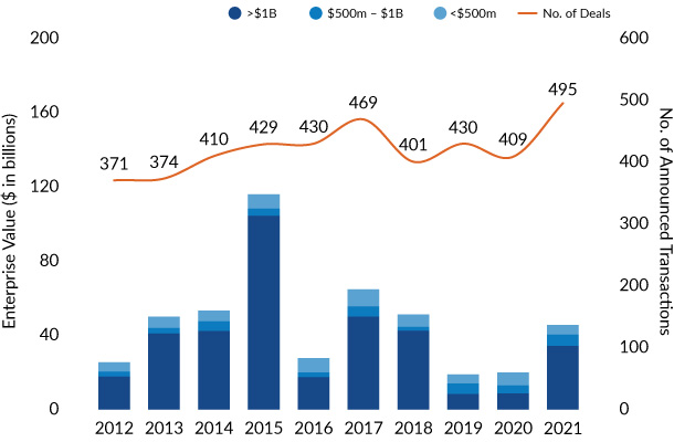 2021 marked a record year for M&A volume in the U.S. food, beverage and agribusiness industry. Increased appetites to drive growth and capital deployment through M&A and strong carryover from 2020 contributed to the record volume. A total of 495 transactions involving U.S. targets were announced, surpassing strong pre-COVID (CY 2019) levels by 15%. Dollar volume more than doubled from $19.7 billion in 2019 to $46.3 billion with mega deals (>$ 1 billion) comprising more than 75% of total 2021 deal value. Sustained, elevated valuations and the potential for a punitive Biden administration change in tax policy accelerated timelines for certain sellers, while a record surplus of private capital and low interest rates continued to fuel strong demand among strategic acquirers and financial sponsors. We saw a modest, but expected deceleration in announced deals in 3Q2021 and 4Q2021 as investors digested the 2020 carryover and holidays entered into the seasonal mix.