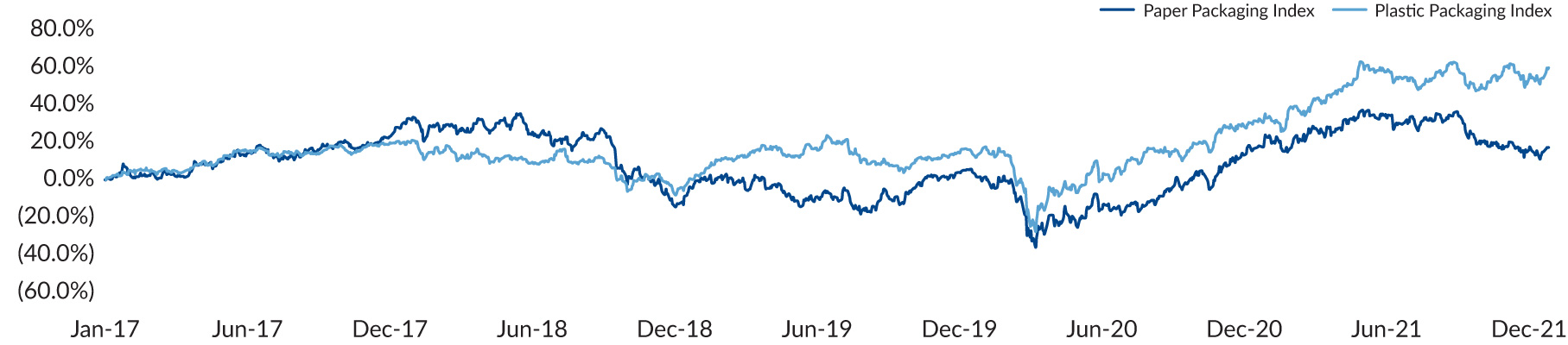 Over the past year, the share prices of packaging companies have increased despite COVID-19 effects, supply chain disruptions and significant inflationary (raw material, labor, etc.) pressures. Share prices for plastic packaging companies ended up 22% for the year, while those for paper packaging companies remained flat. The past five-year share price performance for plastic packaging companies and paper packaging companies have been up 60% and 17%, respectively (Chart 1), both underperforming the overall market (S&P 500 Index up 111%).
