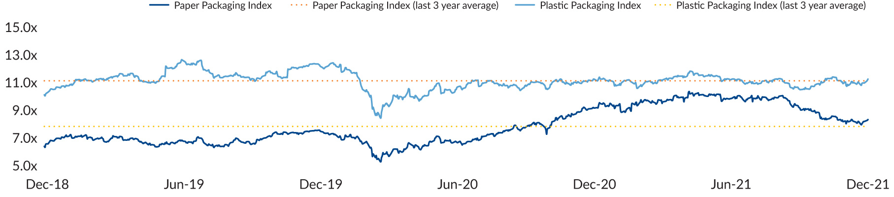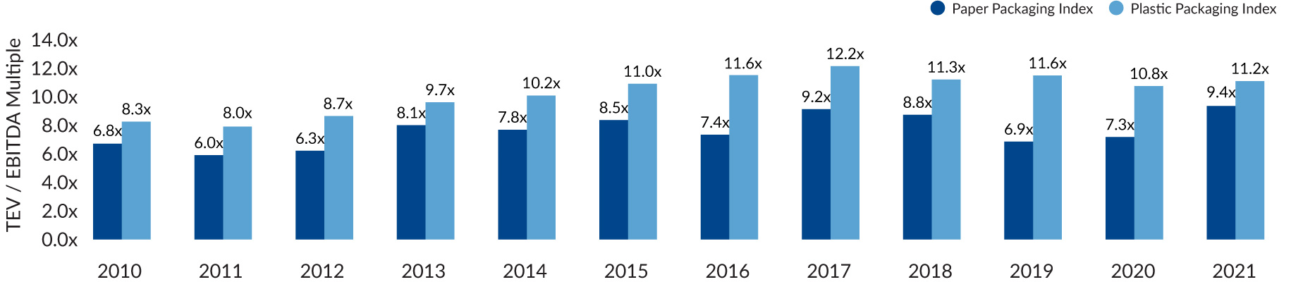 Public market valuations for both plastic and paper packaging companies also increased in 2021 from last year. Plastic packaging companies’ valuations at the end of the year were at 11.3x EV / EBITDA, slightly above their three-year average of 11.2x, while paper packaging companies’ valuations were at 8.4x EV / EBITDA versus their three-year average of 7.9x (Charts 2 and 3).