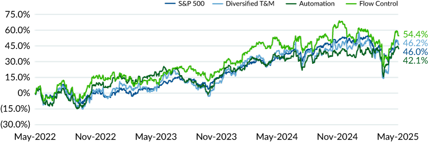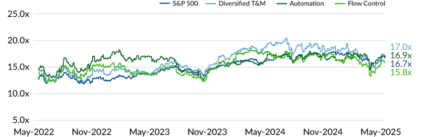 Valuations in the Test & Measurement and Industrial Automation (TM&IA) sector have rebounded along with the broader market since the Liberation Day sell off. However, each of the indices are trading below the three-year average EV/EBTIDA multiple by approximately 0.5x compared to +1.7x for the S&P 500.
