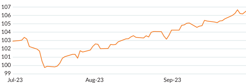US dollar strengthened broadly over Q3, outperforming the G10 currencies save a stronger Norwegian Krone. The Fed delivered their one and only hike in the beginning of the quarter, raising rates by 25bps to 5.5%. CPI numbers were as expected with the latest readings for headline at 0.6% MoM and core at 0.3% MoM. With the market anticipating another 25bps hike by year-end, soft landing hopes for the US economy are still balanced along with concerns that rates may need to stay higher for longer.