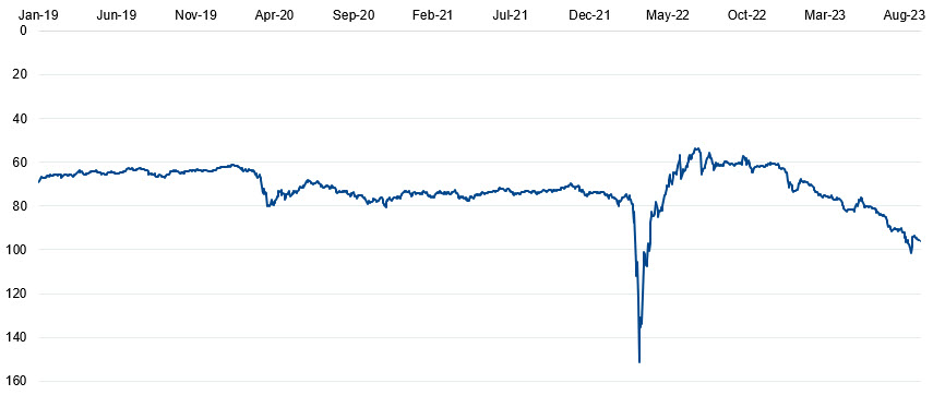 FIGURE 1: US DOLLAR IN TERMS OF RUSSIAN RUBLES (JANUARY 2019–AUGUST 2023)