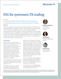 This article explains how we incorporate ESG data within our systematic FX trading strategies. Our approach uses an in-house data acquisition, cleansing, restructuring, and standardisation pipeline. Our proprietary algorithm dynamically assesses ESG indicators in order to promote the most compatible and demote the least compatible factors depending on recent FX market data. Our 10 years backtest shows incorporating this data as part of a systematic FX strategy can generate uncorrelated signals and be used as a complementary source to other types of economic data.