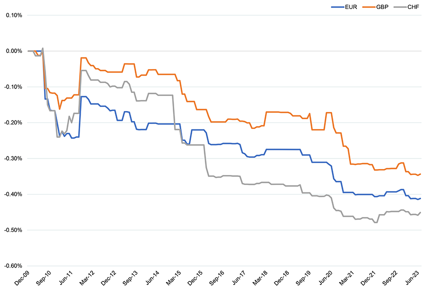 Cumulative loss at close on month-end to close on month-end plus one business day December 2009 to July 2023 for EUR, GBP and CHF