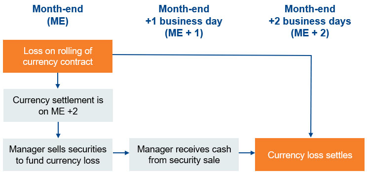 At month-end, if rolling currency contract results in a loss then currency settlement is two days after month-end. The managers sells securities to fund currency loss at month-end, then receives cash one day after month-end.