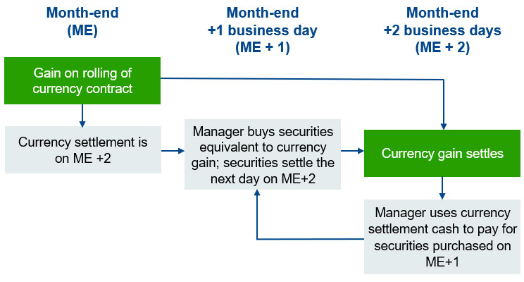 To be fully invested, the manager would prefer to buy securities at month end (ME); settlement of those securities would be on ME+1 business day, but cash from the currency settlement, needed to pay for the securities, would not be available until ME + 2 business days. Thus, the investment manager must delay the reinvestment of those currency gains for one day.