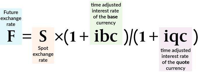 F = S * (1+ ibc) / (1+iqc) where F is the futures price, S is the spot rate, ibc is the base currency interest rate, and iqc is the quote currency interest rate.