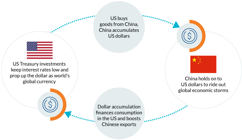 A pattern appeared: The US bought goods from these Asian countries who accumulated dollars, leading to an overvalued dollar and highly competitive currencies that boosted emerging market exports. That dollar accumulation helped reduce interest rates, financed deficit consumption by the US, and propped up the dollar as the world’s global currency. This economic structure is often referred to as Bretton Woods II.3