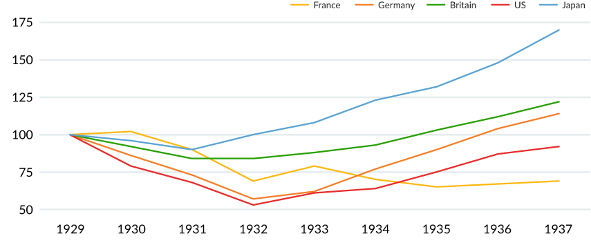 Others take a different view, claiming that those currency devaluations may have worsened economic problems at first, but countries that took themselves off the gold standard and let their currencies devalue experienced improvements in their financial conditions (Figure 1). Freedom from the gold standard allowed countries to take steps to inflate the money supply to stimulate demand.
