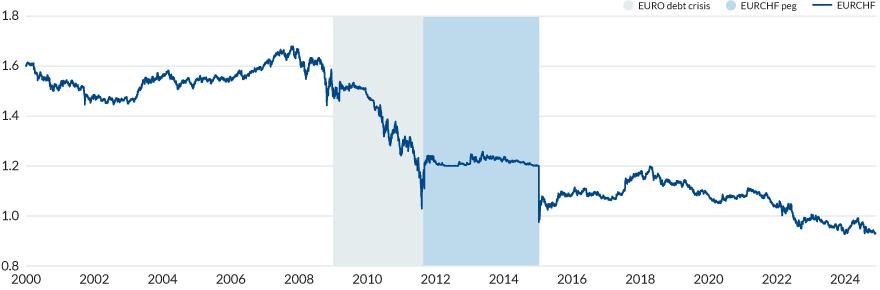 From September 2011 to January 2015, the SNB pegged the franc to the euro to improve the competitiveness of Swiss exports to European customers. The central bank held the exchange rate steady at 1.2 Swiss francs to the euro (Figure 1), essentially hedging euro currency risk for Swiss pension funds and exporters for free. The unexpected withdrawal of the peg on 15 January 2015 shocked the currency markets, caused the franc to rise sharply and left Swiss pension fund managers with long-lasting memories of an exceptionally unpleasant event. Given this experience and the uncertainty of future central bank currency intervention, Swiss investors are inclined to hedge currency risk.