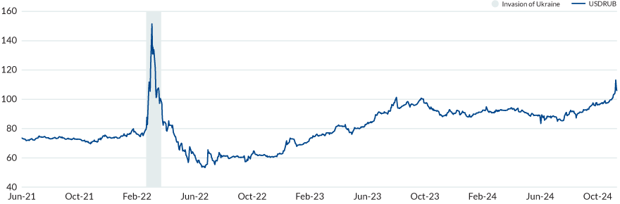 In Figure 2, the Russian invasion of Ukraine on 24 February 2022 led investors to dump Russian rubles and buy US dollars. The ruble recovered briefly but succumbed to a strong upward move in the dollar that began in June 2022. That move was in response to a Russian war economy troubled by a tight labor market, high interest rates and rising inflation.