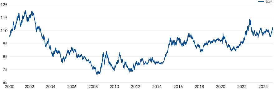 Still, US managers could benefit from currency hedging. A primary, but basic rationale for hedging would be that while the dollar is cyclical, the cycles can be lengthy; the current upward trend of the dollar began in the spring of 2011, over thirteen years ago. In hindsight, it would have been beneficial for US managers to have hedged this currency risk.