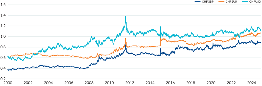 US and Swiss pension fund managers face different currency risk situations. The Swiss franc trends upward against many currencies (Figure 6), exerting consistent downward pressure on the value of international investments denominated in weaker foreign currencies.