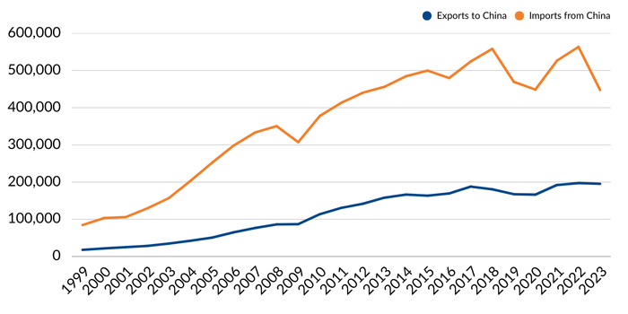 FIGURE 2: EXPORTS TO AND IMPORTS FROM CHINA ($m)