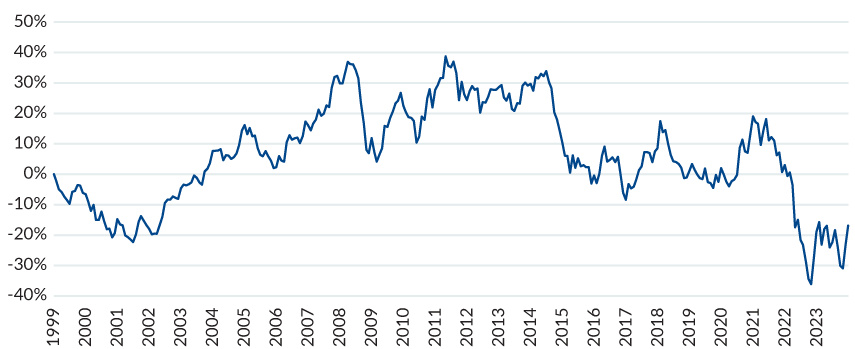 Historically, developed market currencies have not added or detracted meaningful return in multi-decade time horizons. Since the introduction of the Euro in 1999, EAFE currencies have gone full cycle, crossing the 0% return line again in early 2022 (Figure 1).